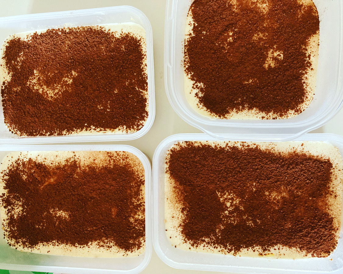 ①ビスケットを大きな器(わたしはタッパー4つ)にまんべんなく分け、コーヒーを入れて、ビスケットを少し柔らかくして全てのタッパーに敷き詰める→1㎝にもならないくらいでOK。